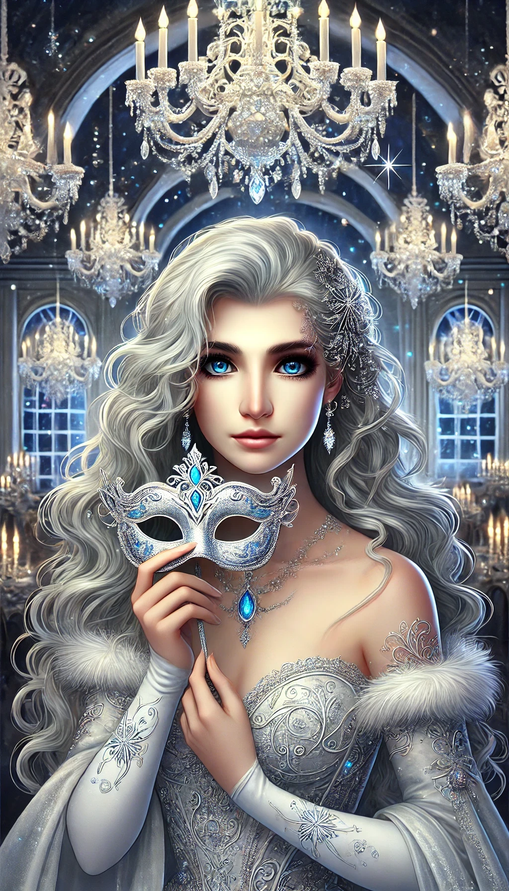 Hair : Silver-white, cascading in flowing waves often braided for practicality.